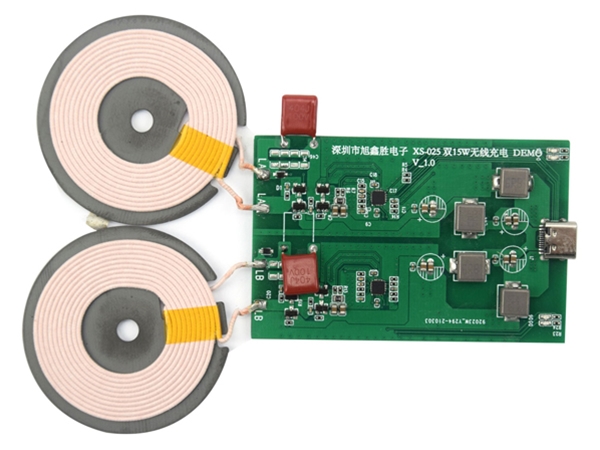 无线充电管理芯片XS025, 单芯片集成无线充电收发模块及小信号解码电路,外加部分客户自定义软件可轻松实现WPCQi等各类无线充电方案。支持PD等多种协议快充输入,支持5W、7.5W、10W 无线充电输出。XS025片内集成全桥NMOS驱动,FSK/ASK 解码,过压过流过温检测保护,集成度高,外部器件少,可广泛应用于各类无线充电底座支架等设计。